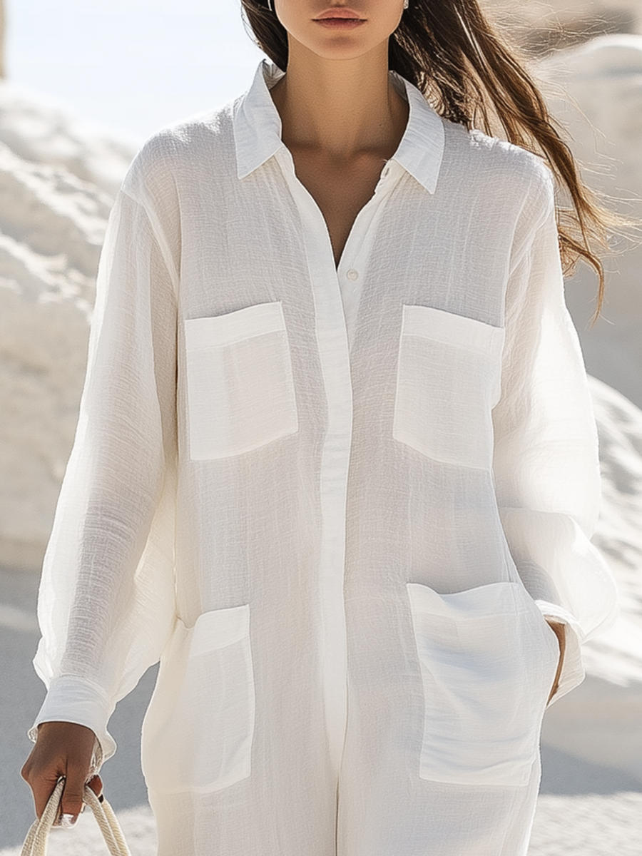 Este mono informal y sencillo de manga larga presenta un cuello clásico con solapa y múltiples bolsillos funcionales, combinando un diseño práctico con un estilo desenfadado. Confeccionado en tejido cómodo y resistente, ofrece un corte holgado, perfecto para el día a día. Sus líneas limpias y detalles funcionales crean una prenda versátil que equilibra comodidad y practicidad.