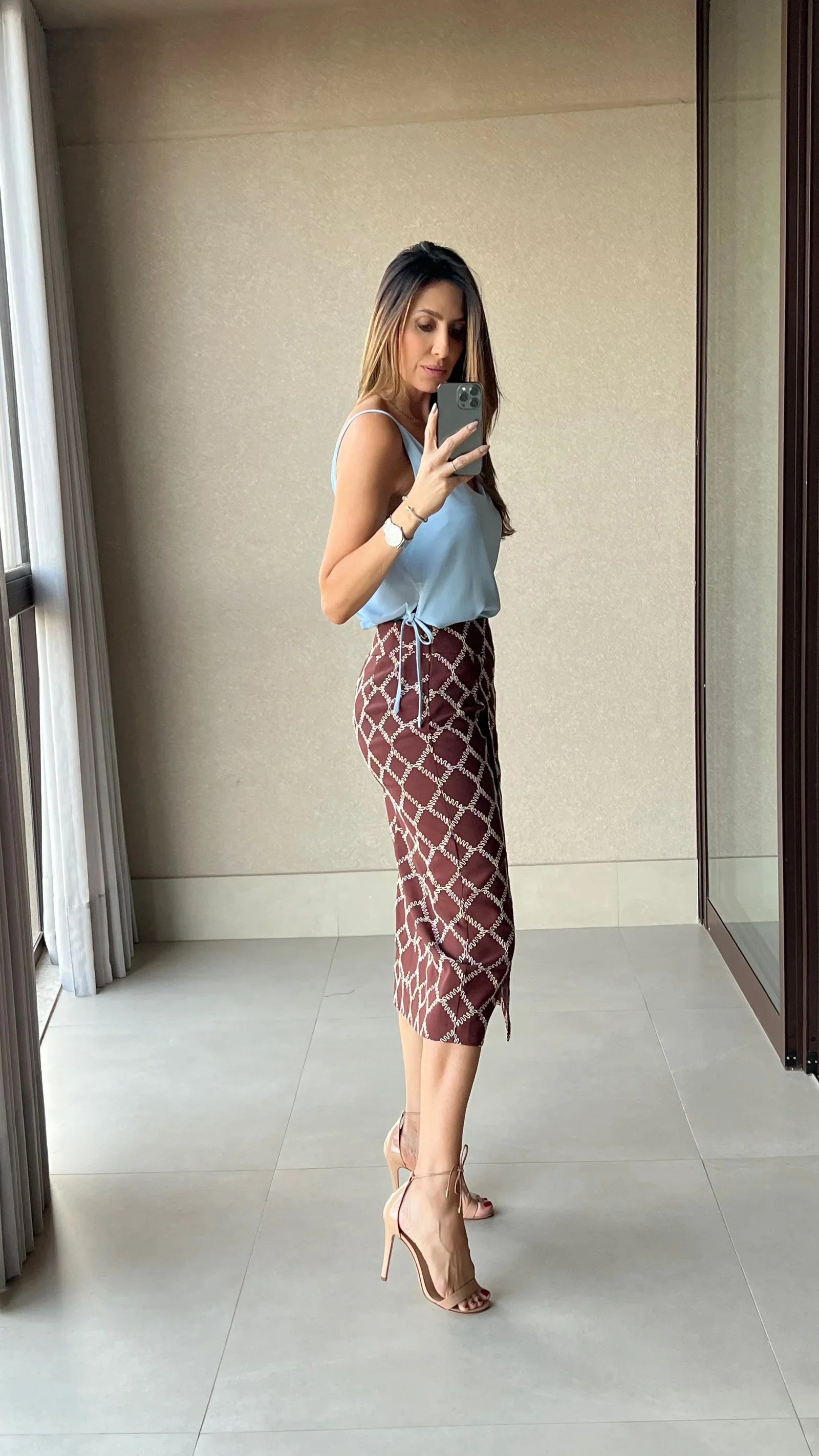 La falda midi, con un fondo marrón tierra y un estampado bordado en blanco roto, transmite sofisticación con un toque contemporáneo. Su largo equilibrado y corte fluido realzan la silueta con discreción y elegancia, mientras que el sutil estampado gráfico aporta un toque de moda sin resultar pesada.
