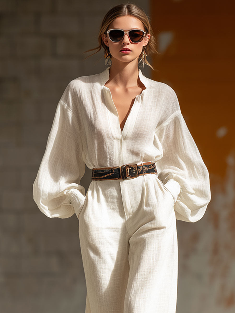 Mono vintage blanco de algodón y lino con mangas largas, cordones y pernera ancha